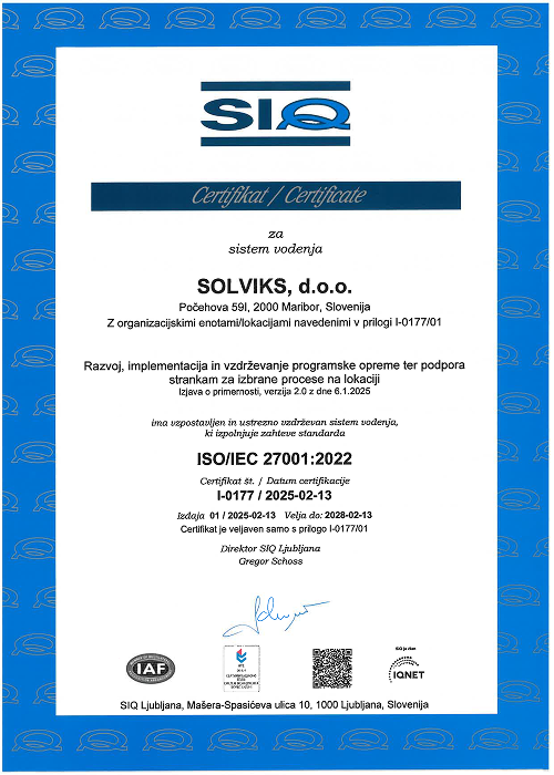 The ISO/IEC 27001 certificate, issued by the independent authority SIQ Ljubljana, confirms that we have implemented an effective information security management system (ISMS) that: