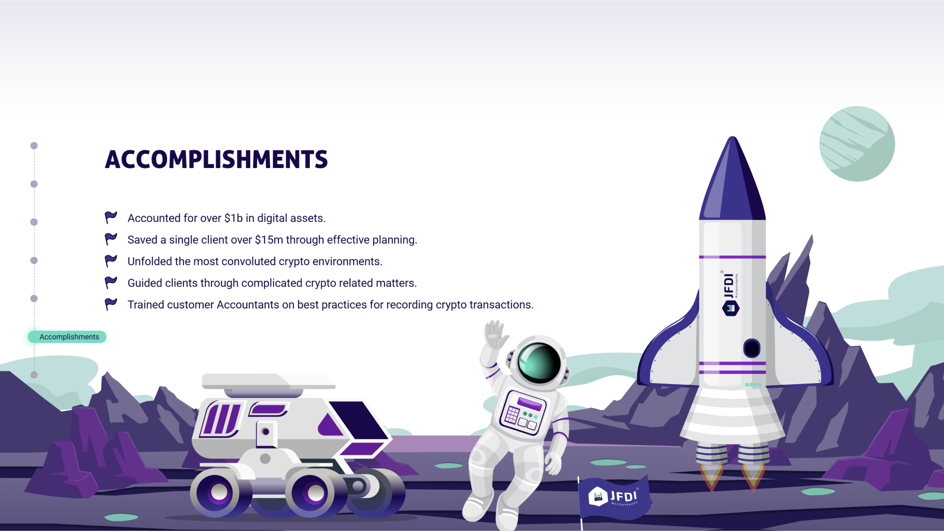 Za Ameriško podjetje JFDI Accountants smo zasnovali barvito in animirano spletno stran, s kreativnim pristopom, unikatnimi ilustracijami in dinamičnimi vizualnimi elementi.